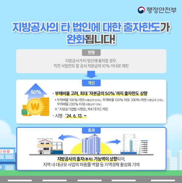 행정안전부는 지방공사가 다른 법인에 출자할 수 있는 한도를 최대 자본금의 50%까지 확대하는 내용의'지방공기업법 시행령'개정안이 6월 13일(목)부터 시행된다고 밝혔다.