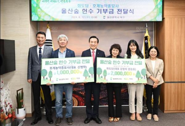 한식 전문점 '화도담'과 호계농약종묘사는 12일 백년숲 사회적협동조합에 울산숲 헌수 기부금을 지정 기탁했다.
