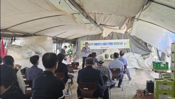부여군농업기술센터는 지난 12일 세도면 귀덕리 임희윤 농가에서 사업관계자, 농업인 등 40여 명이 참석한 가운데 애플수박 유통방안 및 품종 다변화 현장평가회를 개최했다.