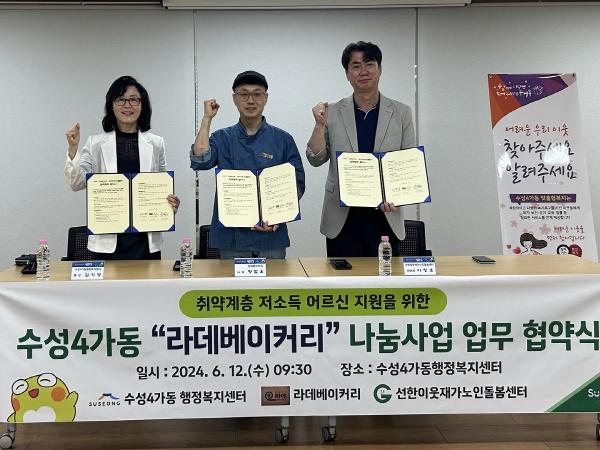 대구 수성구 수성4가동 행정복지센터는 12일 라데베이커리, 선한이웃재가노인돌봄센터와 저소득 어르신 지원을 위한 나눔사업 업무협약을 체결했다.