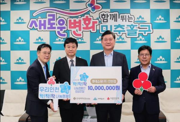 인천 미추홀구에 소재한 롯데백화점 인천점은 13일 인천사회복지공동모금회의 연중 모금 캠페인인 ‘우리 인천, 희망 여름 착! 착! 착! 나눔 캠페인’을 통해 성금 1천만 원을 미추홀구에 전달했다.