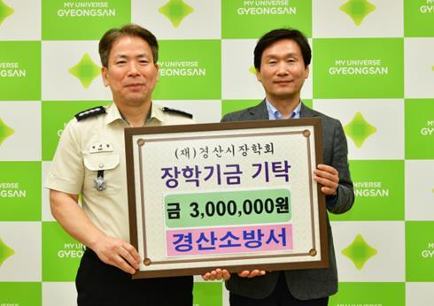 (재)경산시장학회는 경산소방서가 13일 시청을 방문하여 인재 육성을 위한 장학금 300만원을 기탁했다고 밝혔다.