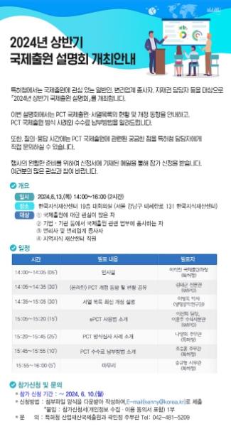 특허청은 6월 13일 14시 한국지식재산센터(서울시 강남구)에서 국제출원에 관심 있는 일반인, 변리업계 종사자, 기업 지식재산권 담당자 등을 대상으로 ‘2024년 상반기 국제출원 설명회’를 개최한다고 밝혔다.