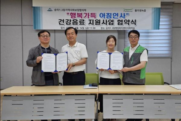 미추홀구 숭의1·3동 지역사회보장협의체는 14일 풀무원녹즙과 ‘행복 가득 아침 인사 건강음료 지원사업’ 협약을 체결했다.