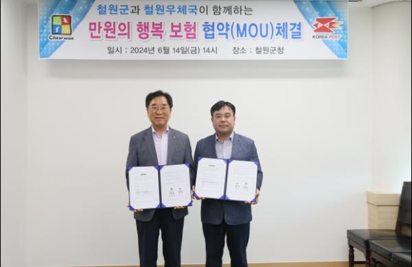 철원군은 14일 철원우체국과 함께 저소득을 위한 우체국 “만원의 행복보험” 가입 업무협약을 체결했다고 밝혔다.