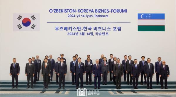 윤석열 대통령은 6월14일 오후 타슈켄트 시티 콩그레스 홀에서 열린 ?한-우즈베키스탄 비즈니스 포럼?에 참석했다. 중앙아시아 3국을 국빈 방문 중인 대통령은 투르크메니스탄, 카자흐스탄에 이어 우즈베키스탄에서도 비즈니스 포럼에 참석해 양국 경제인들을 격려했다.