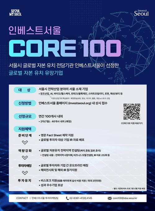 서울시는 서울을 대표하는 글로벌 투자유치 유망기업 CORE100 기업을 7월 15일까지 인베스트서울 홈페이지를 통해 모집한다고 밝혔다. 인공지능, 핀테크 등 서울시 신성장산업 분야의 국내외 투자유치 이력이 있는 기업 40개 내외를 모집할 계획이다. 서울시 창업지원시설의 입주, 졸업기업은 가산점도 받을 수 있다.
