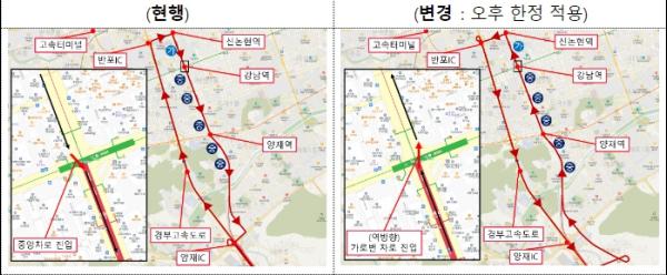② (강남대로 중앙차로 운행 분산) 강남대로 중앙버스전용차로의 정체를 완화하기 위해 15개 노선을 일부 구간에서 가로변 차로로 조정한다.