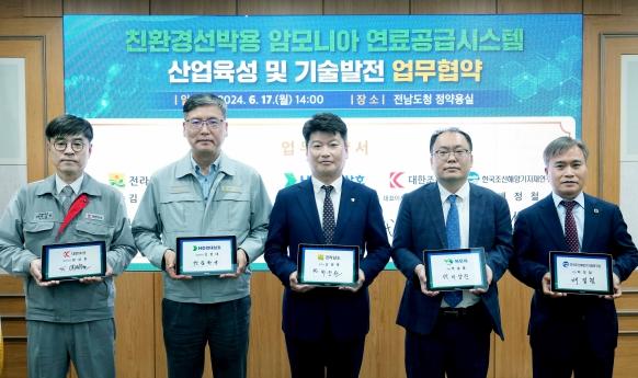 전라남도는 17일 도청 정약용실에서 목포시, HD현대삼호, 대한조선(주), (재)한국조선해양기자재연구원과 ‘친환경 선박용 암모니아 연료 공급장치 및 시스템 실증기반 구축사업’ 성공을 위한 유관기관 업무협약을 했다.