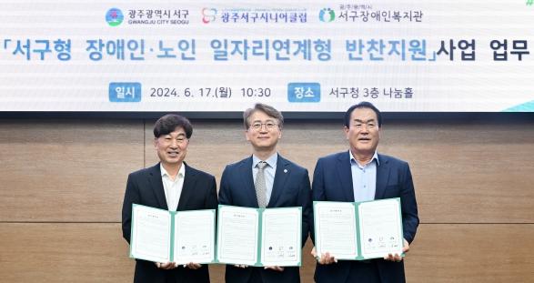 광주광역시 서구가 장애인?노인 공공일자리 협업을 통해 복지 사각지대 해소에 나선다. 서구는 17일 서구청 나눔홀에서 광주서구시니어클럽, 광주광역시 서구장애인복지관과 서구형 장애인-노인 일자리 연계형 반찬지원사업 업무협약을 체결했다.