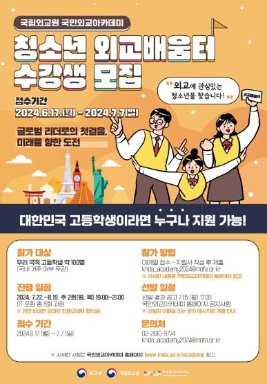 외교부 국립외교원은 7월 22일부터 8월 19일까지 매주 월, 목요일 저녁(19:00-21:00) 총 8회에 걸쳐 고등학생 약 100여명 대상 “청소년 외교 배움터” 과정을 비대면으로 운영한다. 참가를 희망하는 대한민국 국적 고등학생은 모집기간(6.17.(월)~7.7.(일)) 중 국립외교원 홈페이지 공지에 따라 신청할 수 있다.