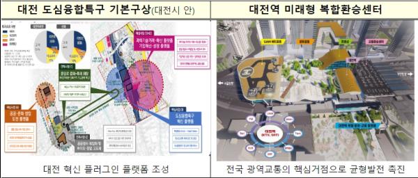 대전 도심융합특구는 대전역 및 옛 충남도청사 일대를 미래형 복합환승센터와 역세권 개발, 지식산업센터 등 청년과 기업이 모일 수 있는 융·복합 성장거점으로 조성하는 사업으로, 충청권 메가시티의 출발점이자 도시공간 혁신의 진원지로 육성할 계획이다.