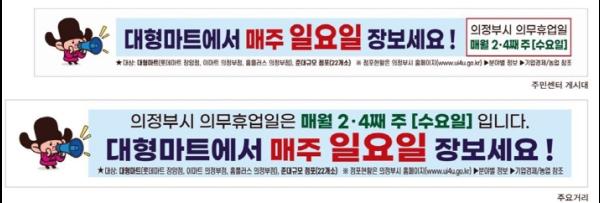 7월부터 의무휴업일이 둘째?넷째 주 수요일에 정상 시행됨에 따라 매주 일요일 롯데마트 장암점, 이마트 의정부점, 홈플러스 의정부점 대형마트 3곳과 22개 준대규모점포에서 쇼핑할 수 있다.
