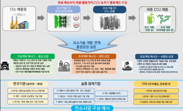 해당 전략의 일환으로 추진되는 ‘CCU 메가 프로젝트’는 ?연구개발 주체(출연연, 대학 등)는 물론, ?이산화탄소 발생원이 존재하는 수요기업, ?CCU 제품 활용 기업, ?감축량 평가·검증 기관 등이 모두 참여하는 컨소시엄 형태로, 이산화탄소 공급부터 제품 활용까지 이산화탄소 포집·활용 전주기 밸류체인을 구성하여 CCU 비즈니스 모델을 확보하는 것을 목표로 대규모 실증을 지원하는 사업이다.