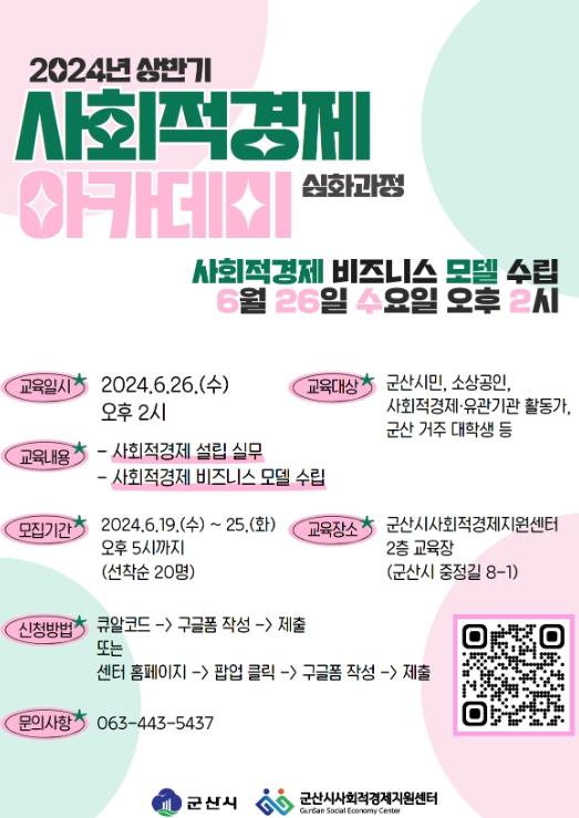 교육을 받기 원한다면 6월 19일부터 25일까지 군산시 사회적경제지원센터 홈페이지내 구글폼을 통해 신청해야 한다.