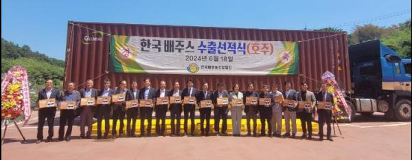 진주시는 18일 문산읍에 위치한 한국배영농조합법인에서 가공한‘배주스를 호주에 첫 수출하는 선적식’을 가졌다.