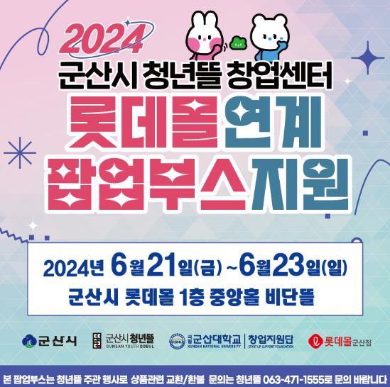 군산시 청년뜰 창업센터는 지역 창업가의 제품 홍보와 판로개척을 위한 ‘롯데몰 연계 팝업부스 지원’ 행사를 오는 6월 21일부터 23일까지 3일간 롯데몰 군산점 1층 중앙홀(비단뜰)에서 진행한다.