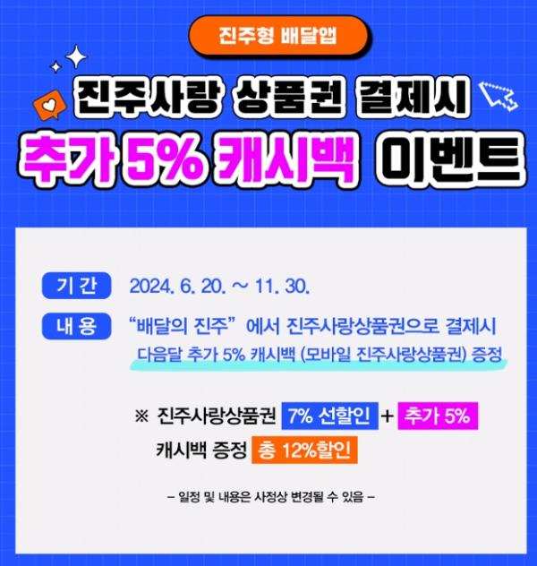 이벤트 기간은 6월 20일부터 11월 30일까지이며, 진주사랑상품권을 7% 선할인 구매한 후 진주형 공공배달앱 ‘배달의 진주’에서 진주사랑상품권으로 결제 시, 결제금액의 5%를 추가 캐시백으로 다음 달에 돌려받는다.