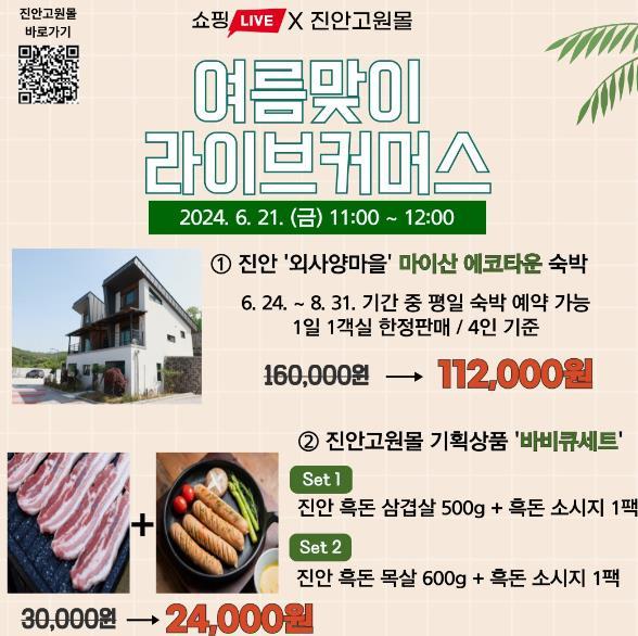 진안군 직영 온라인 쇼핑몰인 '진안고원몰'은 관광객 유치를 위해 오는 21일 11시 네이버스마트스토어 쇼핑 라이브를 통해 이번 여름을 진안에서 즐길 수 있는 숙박과 음식이 결합 된 상품을 선보인다.