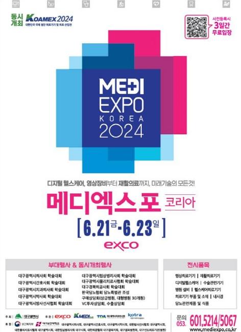 새로운 트렌드의 첨단의료기기 전시, 전문학술대회, 수출·투자상담회 등 의료산업분야 지역 최대 전시회인 ‘2024 메디엑스포 코리아’가 6월 21일부터 6월 23일까지 3일간 대구 엑스코에서 개최된다.