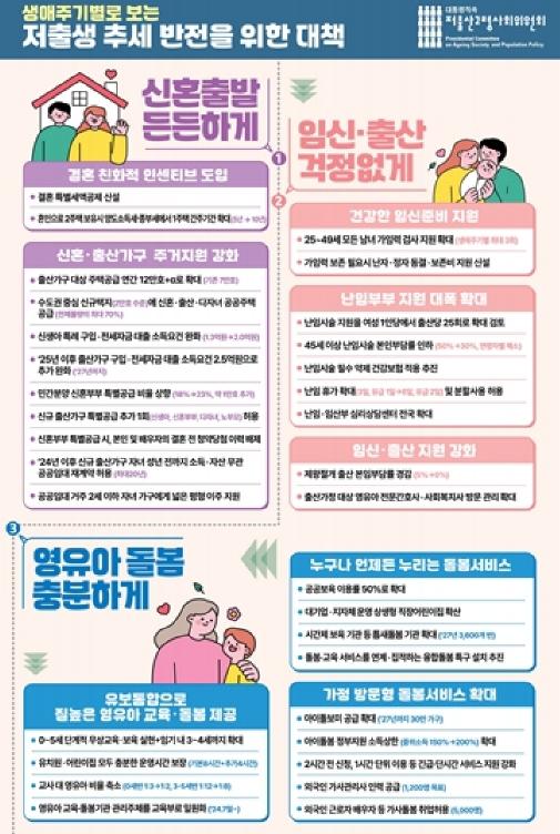 저출산고령사회위원회(위원장: 대통령)는 6월 19일 오후 위원회를 개최하여 '저출생 추세 반전을 위한 대책'을 발표했다.