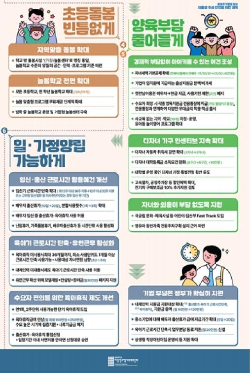 저출생의 직접적 원인이 되고 있는 ?일?가정 양립, ?양육, ?주거 등 3대 핵심분야 지원에 역량을 집중하고, 좋은 일자리 창출, 과도한 경쟁완화를 위한 공교육 내실화, 지방균형발전 등 구조적 요인에 대해서도 지속적으로 대응해 나갈 계획입니다.