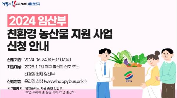 영천시가 오는 24일부터 7월 7일까지 관내 임산부를 대상으로 2024년 임산부 친환경농산물 지원 사업을 신청받는다고 18일 밝혔다.