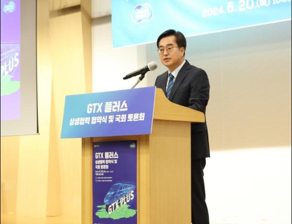 김동연 경기도지사가 경기도 주최 22대 국회 첫 토론회에서 ‘GTX 플러스’ 추진을 위한 상생협력을 약속하며, GTX 플러스의 1석 3조 효과로 대한민국의 국가경쟁력과 성장잠재력을 키우자고 강조했다.
