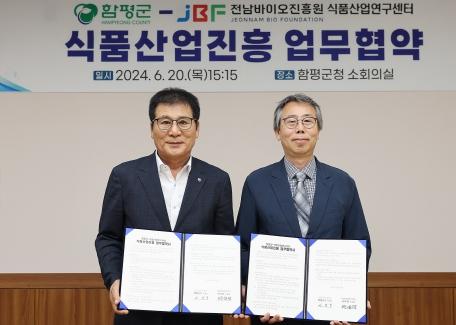 전남 함평군이 전남바이오진흥원 식품산업연구센터와 손잡고 지역 식품제조, 가공업체의 경영 진단 및 제품개발 활성화를 위한 업무협약을 20일 체결했다.