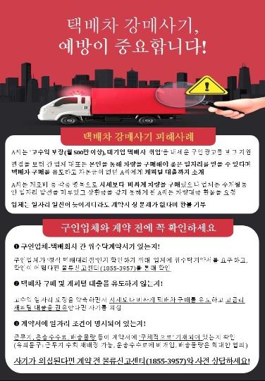 국토교통부는 택배업계에서 이뤄지고 있는 이른바 ‘택배차 강매사기’를 방지하기 위한 예방활동을 강화한다.