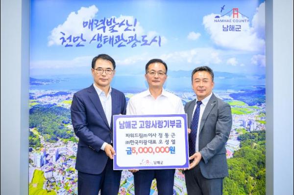 남해군 출신 정동근·오성열 향우가 지난 17일 각 250만 원 씩 총 500만 원의 고향사랑기부금을 기탁하며 지역 사회 발전을 기원했다.