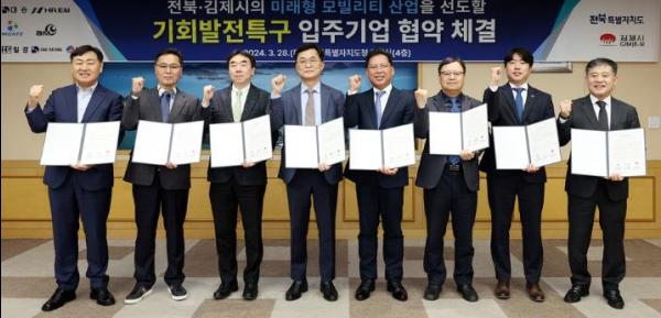 특히 시는 우수 앵커기업 유치를 위해 지난 해부터 미래 모빌리티 기업을 대상으로 적극적인 IR활동을 펼쳐 지난 3월 28일 ㈜대승, ㈜창림모아츠 등 7개기업과 총 4,036억원 규모의 투자, 496명의 일자리 창출을 내용으로 한 투자협약을 체결해 기회발전특구 지정 추진에 힘을 실었다.