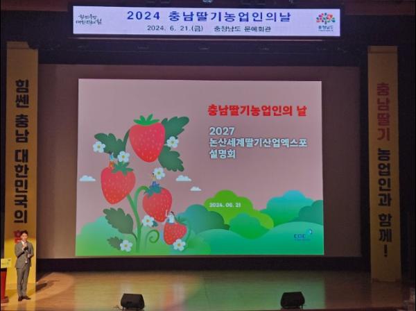 논산시(가 21일 11시 충남도청 문예회관에서 열린『'024 충남 딸기 농업인의 날' 행사에서 ‘2027 논산세계딸기산업엑스포’ 개최계획의 요점을 도내 딸기 농업인과 공유했다.