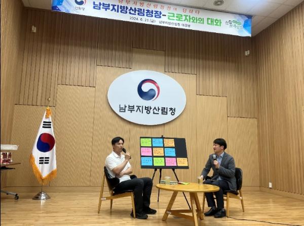 남부지방산림청장(지방청장 최영태)은 21일 지방청 대강당에서 지방청장과 공무직·기간제 근로자, 청년인턴이 자유롭게 질문하고 청렴 문화를 공유하는 ‘남부지방산림청장-근로자와의 대화’의 시간을 가졌다.