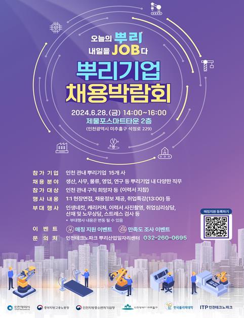 인천광역시는 6월 28일 인천테크노파크, 중부지방고용노동청과 뿌리기업 채용박람회를 제물포스마트타운(JST) 2층에서 공동 개최한다고 밝혔다.