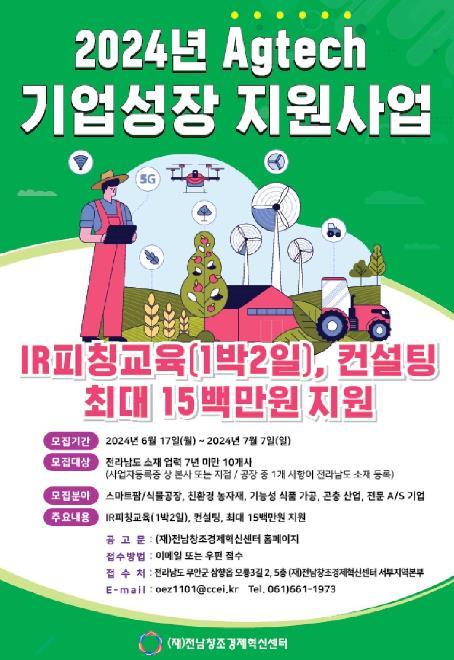 전라남도는 7월 7일까지 애그테크(AgTech)분야의 기업 성장과 투자유치 역량 강화를 위한 지원사업 참여 기업을 모집한다.