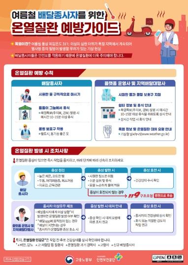 최태호 산업안전보건본부장 직무대리는 “올여름은 많이 덥고, 비도 자주 내릴 것으로 전망되기 때문에 보다 철저한 대비가 필요하다”라며, “이번에 배포하는 가이드가 배달종사자의 건강 및 안전운행을 위한 준비에 도움이 되기를 바란다”라고 당부했다.