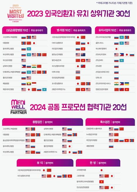 2023년 유치 상위기관 30선은 보건복지부 유치실적 보고 환자수 기준에 따라 ▲종합병원 ▲병의원 ▲유치사업자별 유치상위기관을 선정한 것으로, 부산의료관광을 견인하는 유치기관의 우수콘텐츠를 집중 발굴해 홍보를 지원하고자 ‘중점협력기관’으로 선정했다.