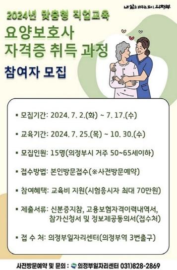 의정부시는 맞춤형 직업교육 취업프로그램 ‘요양보호사 자격증 취득과정’에 참여할 구직자를 모집한다.