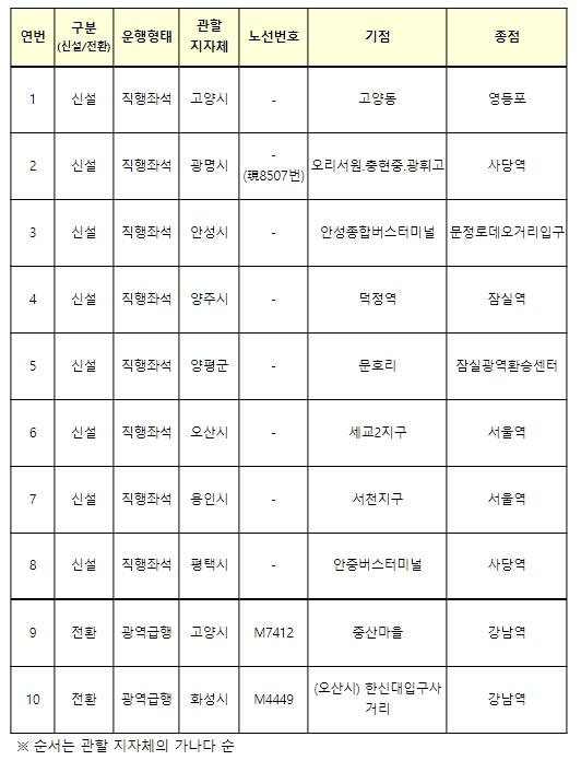 신설 노선은 고양, 광명, 안성, 양주, 양평, 오산, 용인, 평택에서 서울역, 사당역, 영등포, 잠실 등으로 향하는 8개 노선이며, 전환 노선으로는 고양(현 M7412), 화성(현 M4449)의 2개 노선이 선정됐다.