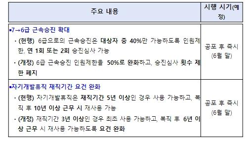 7급에서 6급으로의 근속승진 인원 제한이 완화되고, 연 2회 이내 진행했던 승진심사 횟수 제한이 폐지된다.