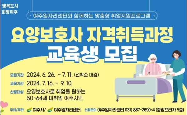 여주시는 6월 26일부터 7월 11일까지 여주일자리센터에서 2024 요양보호사 자격증취득과정 교육생을 모집한다고 밝혔다.