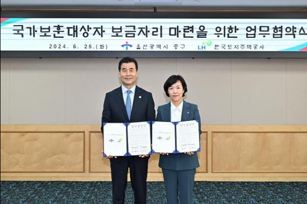 울산 중구와 한국토지주택공사(LH) 부산울산지역본부가 6월 25일 오후 2시 15분 중구청 2층 중회의실에서 전국 최초로 ‘무주택 국가보훈대상자의 보금자리 마련을 위한 업무협약’을 맺었다.