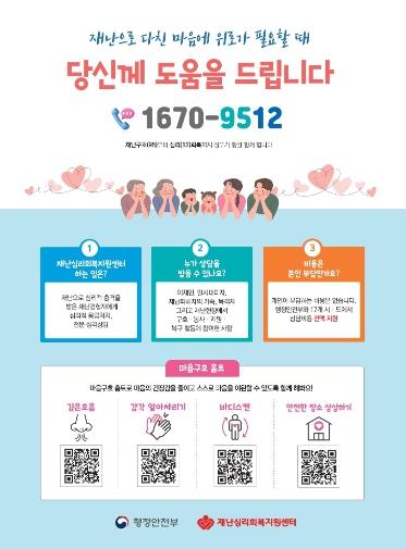 이번 화재로 마음이 힘든 국민은 누구든지 시?도 재난심리회복지원센터에 방문 또는 전화(1670-9512)하거나, 보건복지부 정신건강 위기상담으로 전화하면 심리상담을 받을 수 있다.