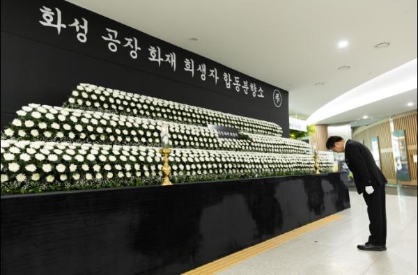 김동연 지사는 26일 아침 경기도청사 1층 로비에 마련된 ‘화성 공장 화재 희생자 합동분향소’에서 조문을 마친 후 언론과 만나 이런 내용을 담은 사고 수습과 추가 대책 등에 대해 설명했다.