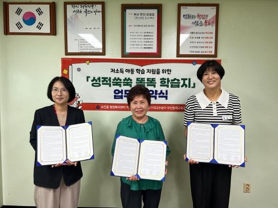 부산 동래구 수민동 지역사회보장협의체는 지난 19일 ㈜대교눈높이 부산동래교육국과 저소득 아동 학습지 지원사업 '성적쑥쑥 똑똑 학습지'협약을 체결했다고 밝혔다.