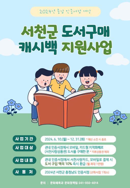 서천군이 지역 서점의 경영난을 해소하고 관내 독서 문화 확산을 위해 ‘2024년 충남 인증서점 도서구매 캐시백 지원’사업을 시행한다.
