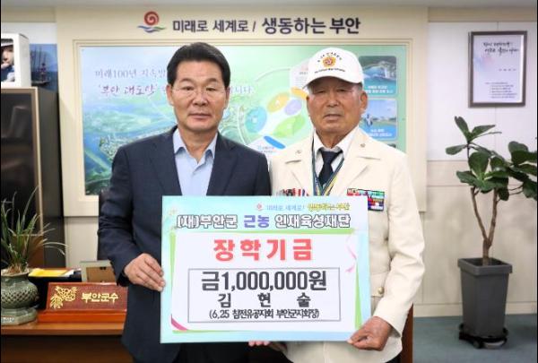 김현술 6.25참전유공자회 부안군지회장은 27일 부안군 근농인재육성재단을 방문하여 지역인재육성을 위해 써달라며 100만원을 장학금으로 기탁했다.