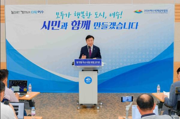 정기명 여수시장이 취임2주년 기자회견에서 “민선8기 후반기에는 주요 현안들에 대해 시민만족과 균형발전, 성과실현 등을 시정 운영방향으로 정해 속도감 있게 강력히 밀어 붙이겠다”고 밝혔다.
