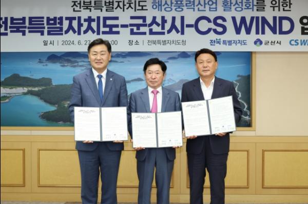 전북자치도는 27일 도청 회의실에서 김관영 도지사를 비롯해 김성권 씨에스윈드 회장, 강임준 군산시장 등이 참석한 가운데 전북특별자치도 해상풍력 및 신재생에너지 사업 협력을 위한 업무협약을 체결했다.